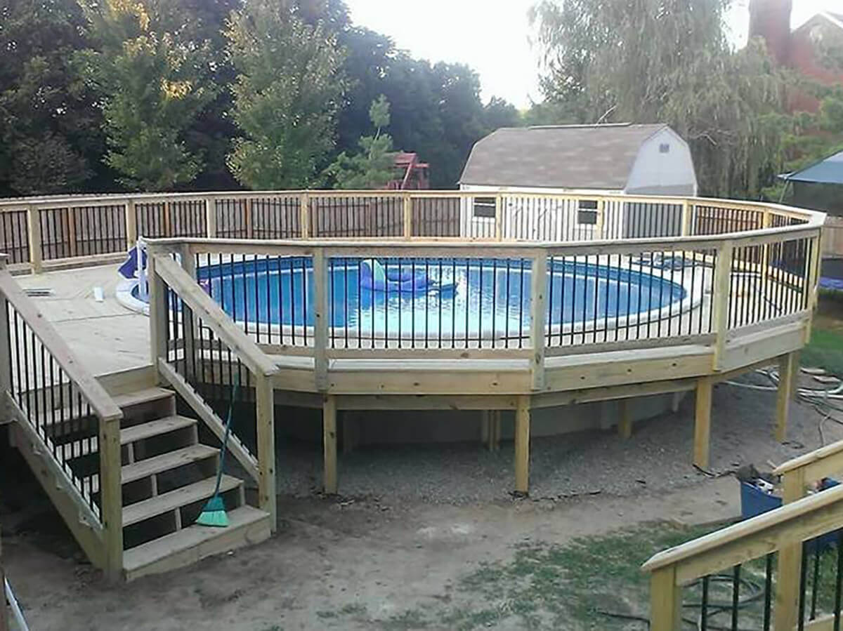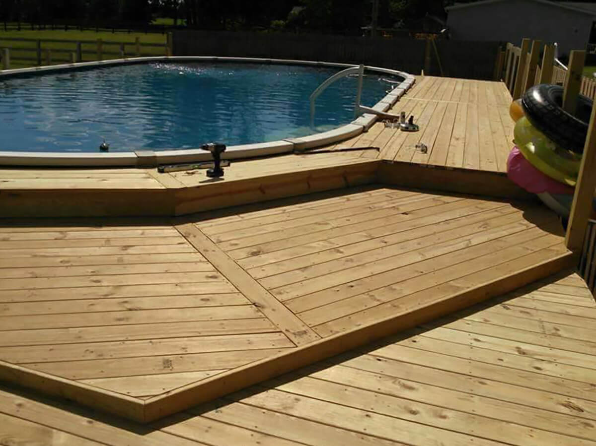 If you're building a deck around an above-ground pool, the size should allow for safe, easy access and room to lounge or walk around the pool. The ideal size will depend on your pool's diameter and how much deck space you want surrounding it. Some homeowners opt for a partial wraparound, while others build a full-circle deck.