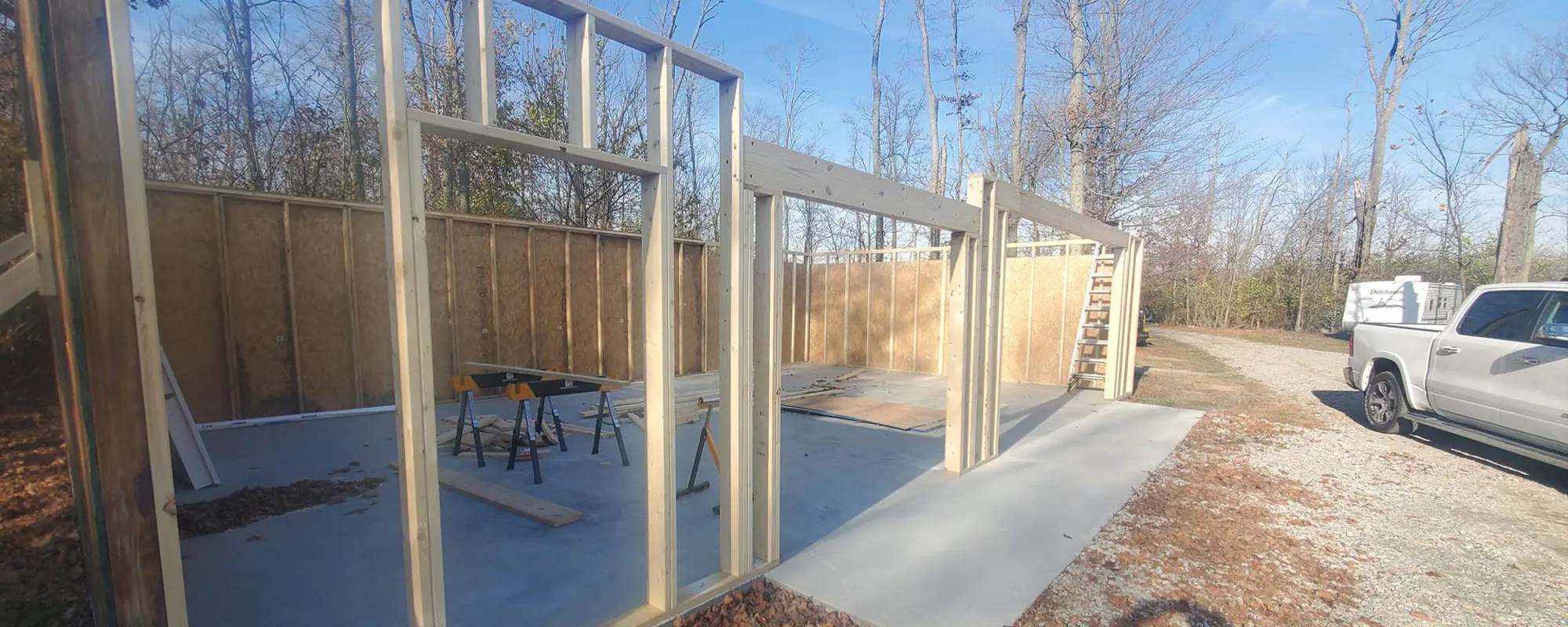 Once framing and roofing are complete, you will notice the structure keeps rain and snow out immediately. Doors open wide enough to move mowers, ATVs, or stacked materials in and out without scraping or angling. Inside, the open span gives you flexibility to add shelving, workbenches, or partitions later if your storage needs change.